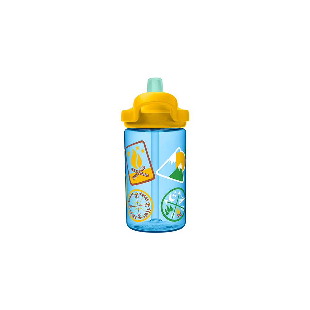 An everyday sidekick to lunch boxes everywhere, the Eddy®+ Kids water bottle is now made with Tritan™ Renew, a highly durable and lightweight plastic. In addition to being a feel-good reusable, Eddy + Kids bottles are spill-proof when open and leak-proof when closed - no more soggy backpacks. Just bite to sip and close when finished. The easy carry handle and fun designs make hydrating fun on any adventure. Cap and bottle are odor and stain resistant, dishwasher safe, and free of BPA, BPS, and BPF. Tritan Renew is made using Polyester Renewal Technology, a recycling process that's more efficient than standard mechanical recycling, producing new material with less demand on finite resources. Fun, functional, sustainable. Recommended for ages 3+. • Flip, Bite, Sip: Drink through straw • Leak-Proof: Leak-proof when closed, spill-proof when open • Easy to Carry: Comfortable carry handle • Lightweight and Durable • Odor and Stain Resistant • Cap Material: BPA-Free Polypropylene. The Big Bite Valve is made from medical grade silicone. • User Group: Kids • BPA/BPS/BPF Free: Yes • Dimensions: 3.11 x 4.33 x 7.09 in / 7.9 x 11 x 18 cm • Material: Tritan Renew • Weight: 6 oz. / 156 gm • Hydration Capacity: 14 oz / .4L • Gear Range: Minimal • Colour: Explorer Patches