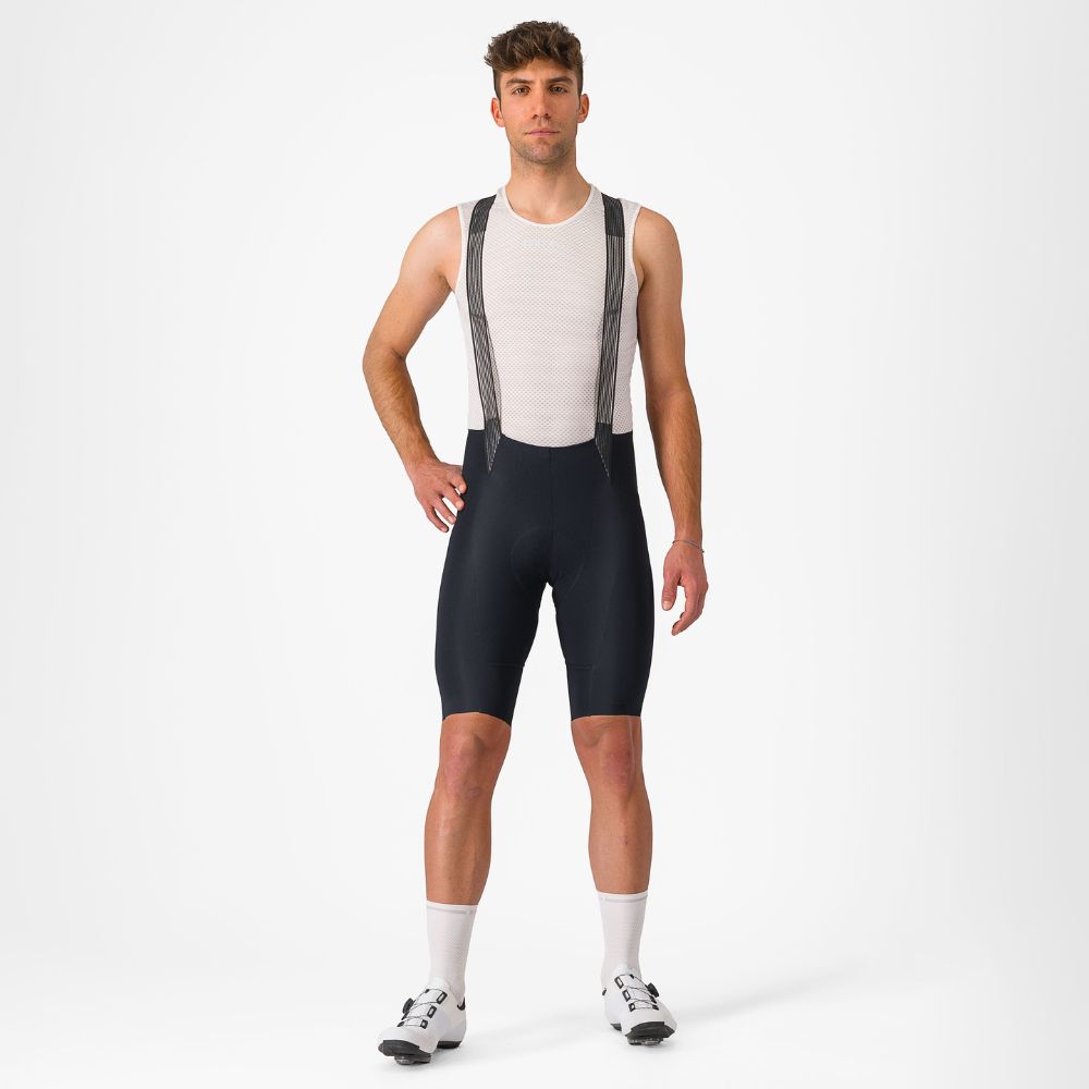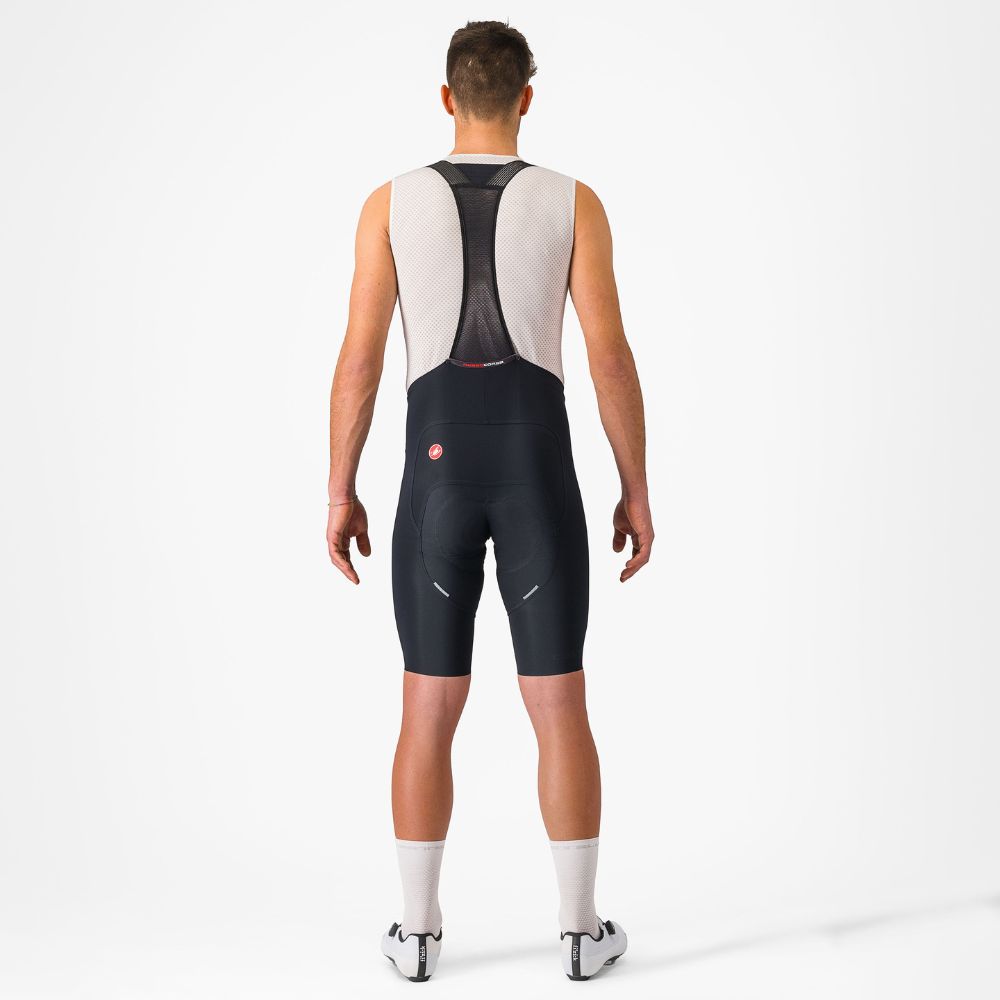 High-compression 215 g Forza 2 fabric with 32% Lycra® content provides exceptional muscle support and compression Progetto X2 Air seamless seat pad is soft against the skin but well padded for long-distance comfort Minimalist bib straps allow maximum airflow, while a reinforced yoke keeps the straps flat over the shoulders Rear mesh pocket 5-panel construction for reduced seams and less chafing Stitched scorpion logo patch and embossed Castelli wordmark for durability Reflective piping on back of legs Raw-cut edge at waist for extra stretch and comfort Raw-cut leg ending engineered to stay put without silicone grippers Weight:217 g Temperature:15°C - 35°C / 59°F - 95°F Fit: Race