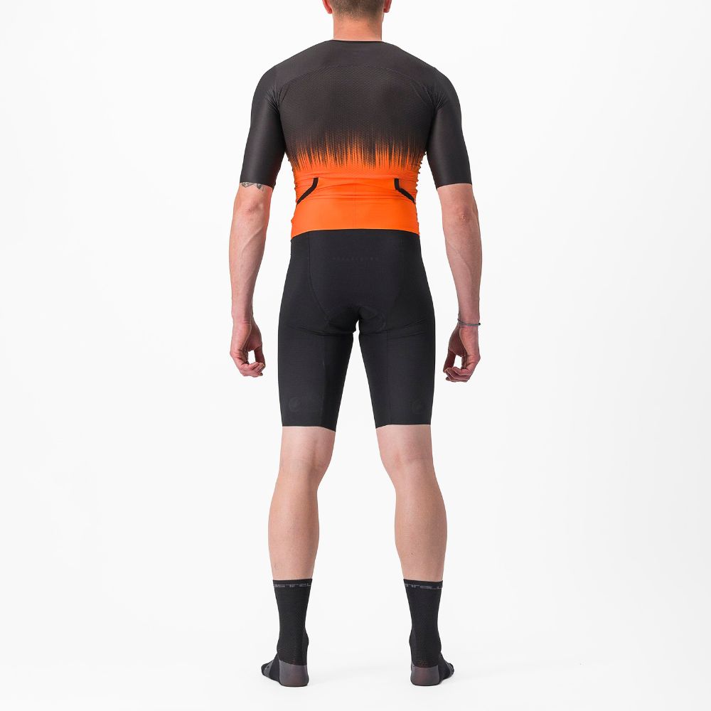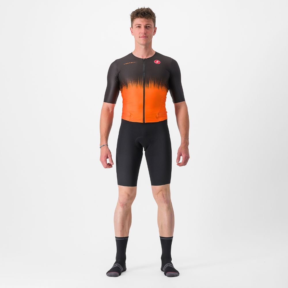 Castelli's Sanremo front opening makes it easier to bend for cycling and straighten out for the run and swim, while also allowing for easier nature breaks or opening up for extra-hot runs_x000D_