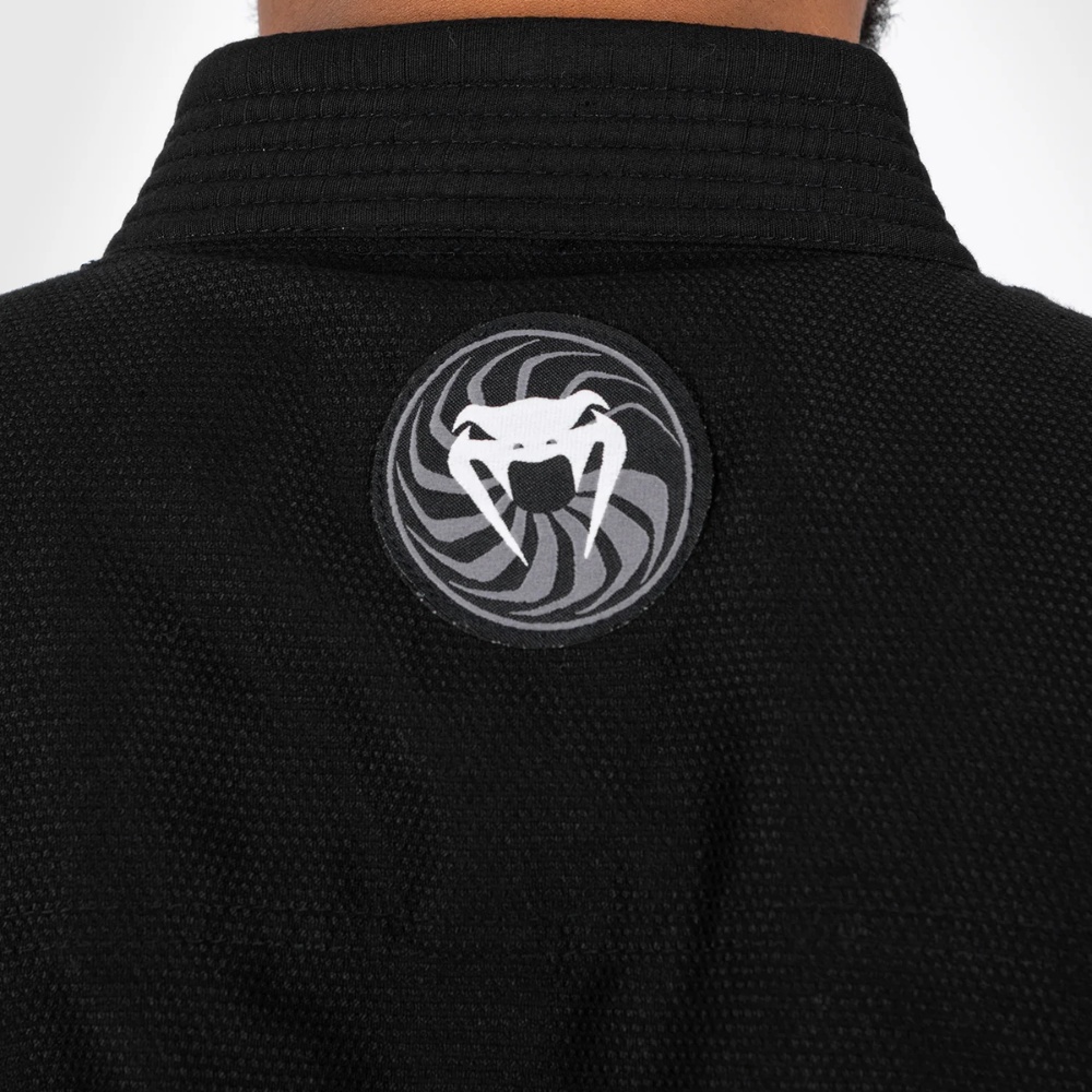 Venum First BJJ Gi in black features gray-purple patches with Venum logos in white at the shoulders, lower hem and hip for a complete look. Belt included.